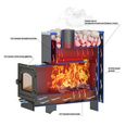 Дровяная печь для бани Везувий Русичъ предназначена для отопления парильного помещения бани или сауны, получения пара и нагрева воды. Максимальная площадь отапливаемого помещения 30 м3. Изготовлена из особо прочной котловой стали марки 09Г2С 6-8мм. Дверца для печи из чугуна. Выносной топливный канал помогает растапливать печь, находясь в предбаннике, и благодаря этому в парной сохраняется чистота. Так же можно следить за огнем, не проходя в одежде в натопленное помещение. Открытая каменка вмещает до 40 кг камней, позволяя равномерно распределить температуру в парной.
